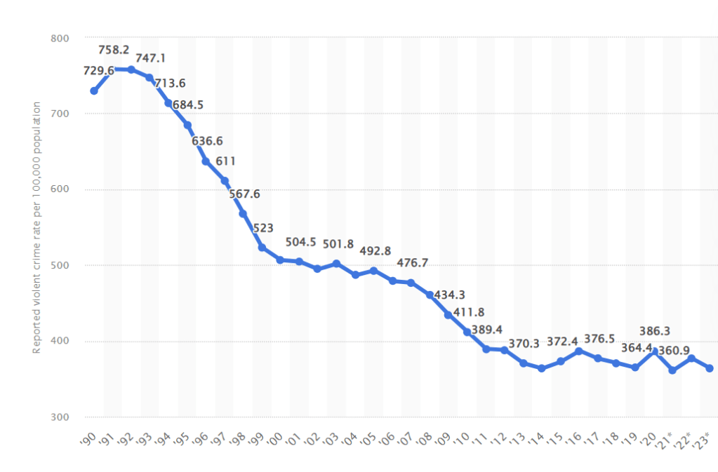 Here is a graph of the violent crime rate over the years. We see that violent crime has decreased drastically. Link if you care.